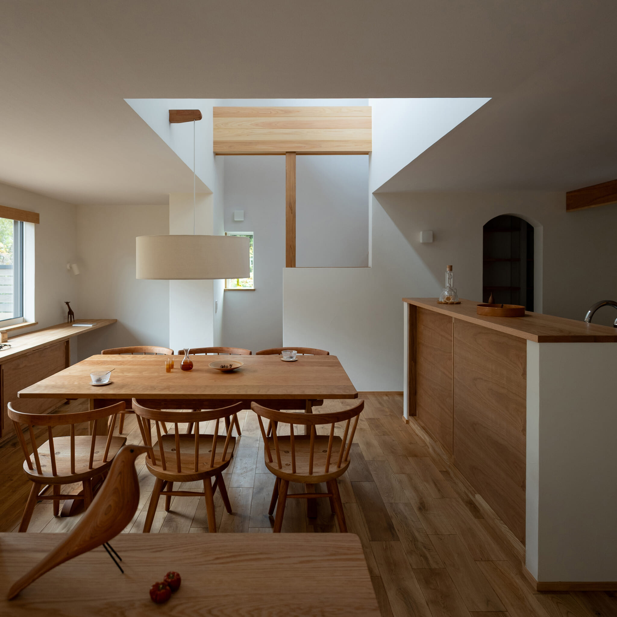 南面の増築部分を減築し、南面のプライベートな庭をしっかりとり確保、吹抜を家の中心に据え、ハイサイドライトから降り注ぐ陽光と3D的なワンルーム空間により家中どこでも家族の雰囲気を感じる構成にしました。