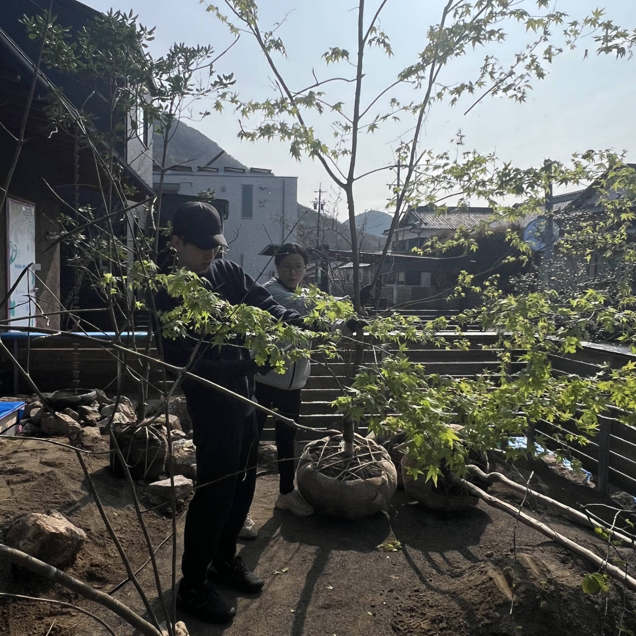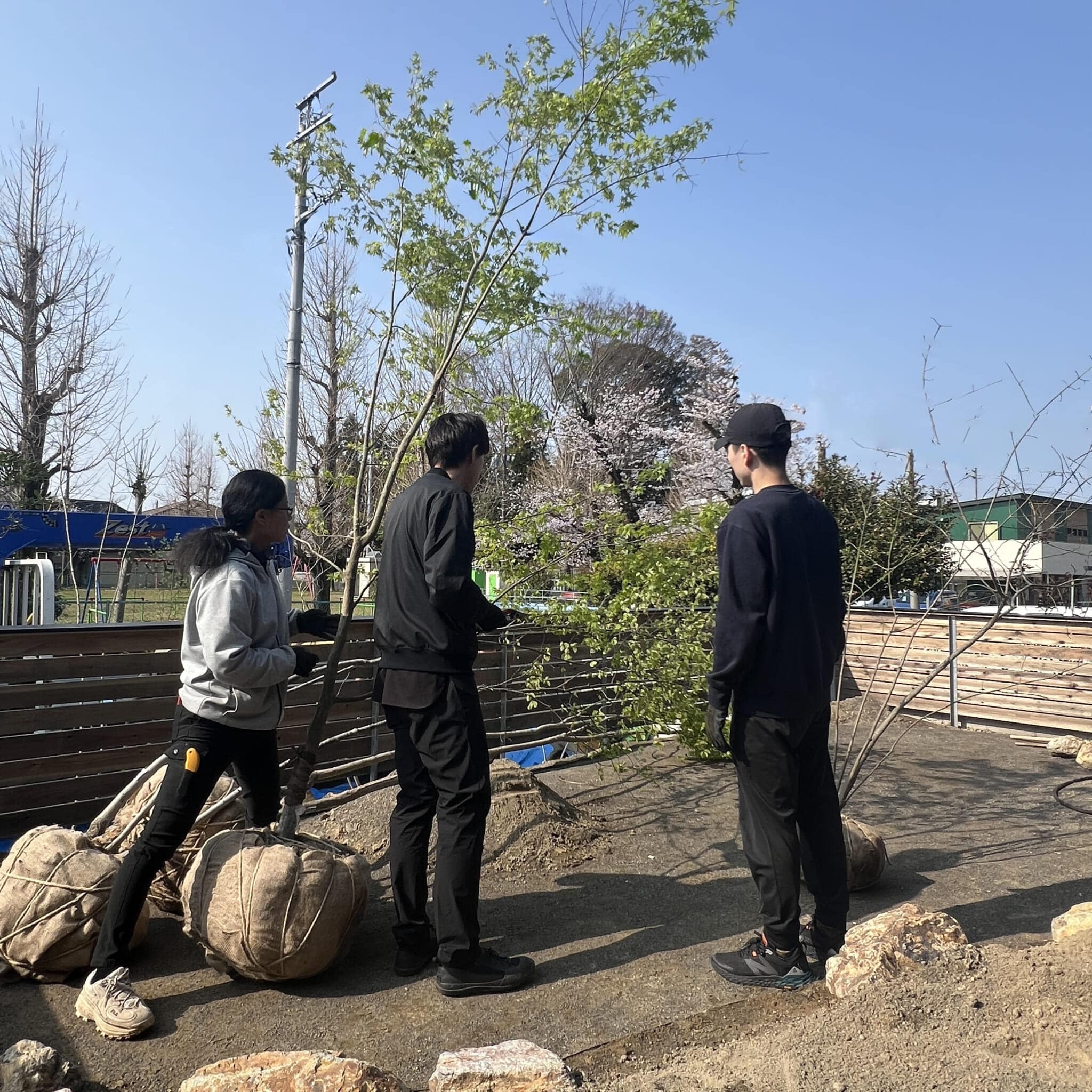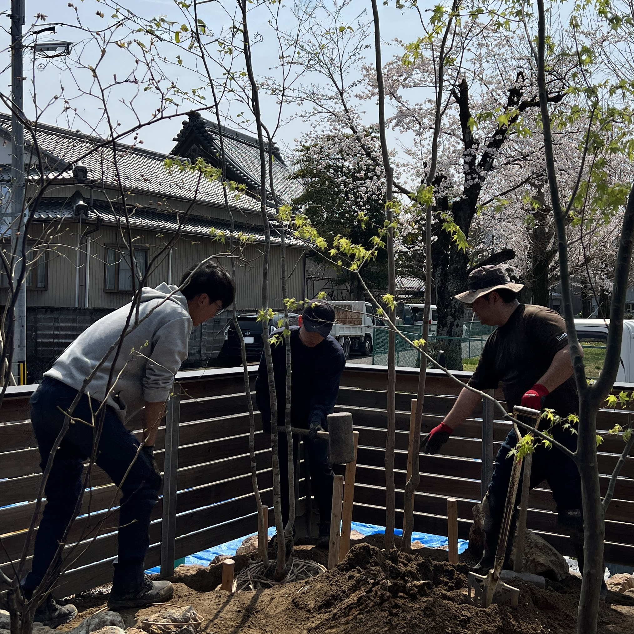 剪定から高木等の固定のくい打ちまで、旦那さんが積極的に楽しみながら作業されているのが印象的です。