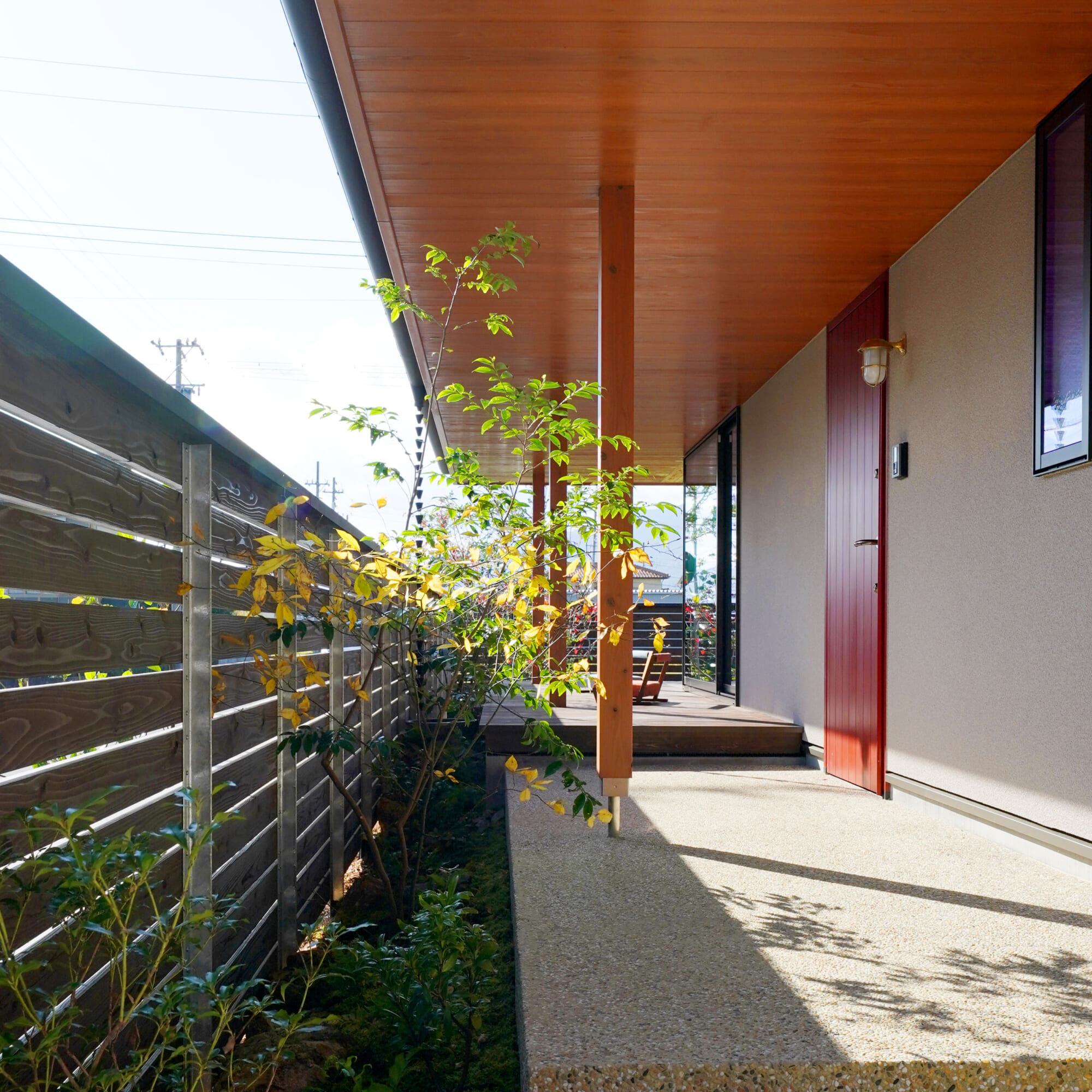 奥行きの深い屋根がL型形状に約30mに渡り建物を包む。