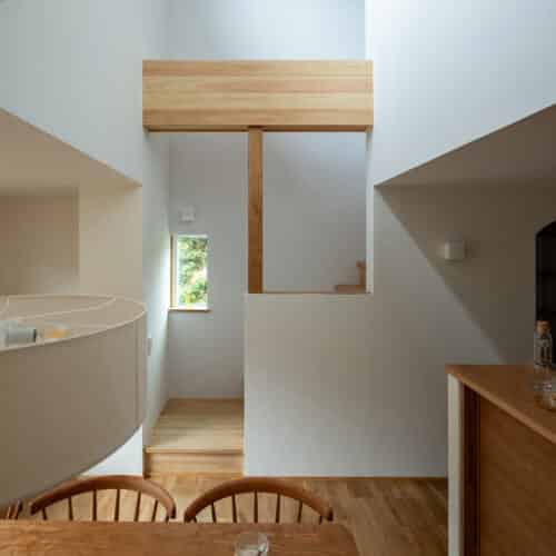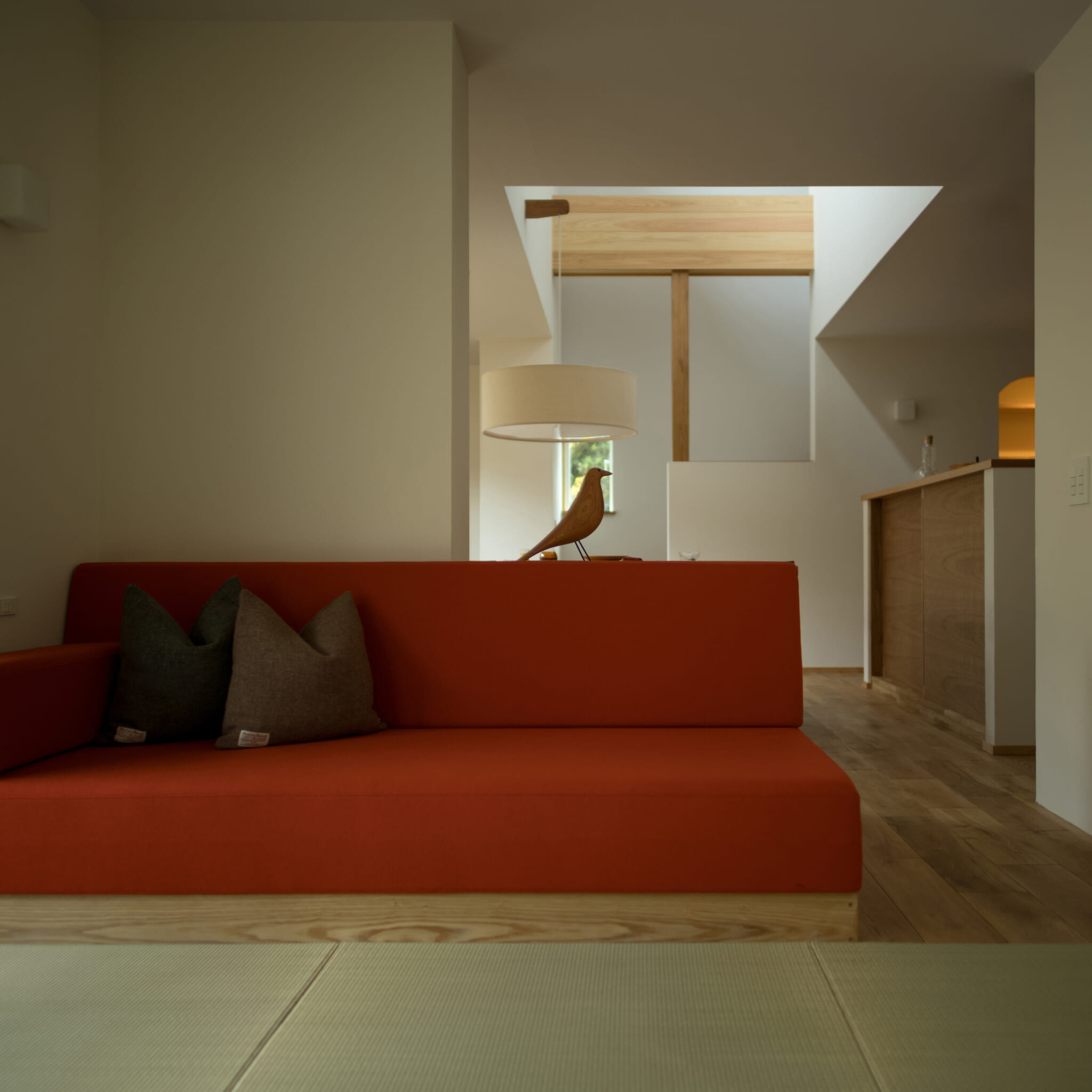 中央に据えた大きな吹抜と大きく確保した広い南の庭を見ながら、誕生したばかりのお子様と共に春ののんびりと明るい昼間に長閑で心地よく過ごすシーンをインスピレーションにしながら設計いたしました。