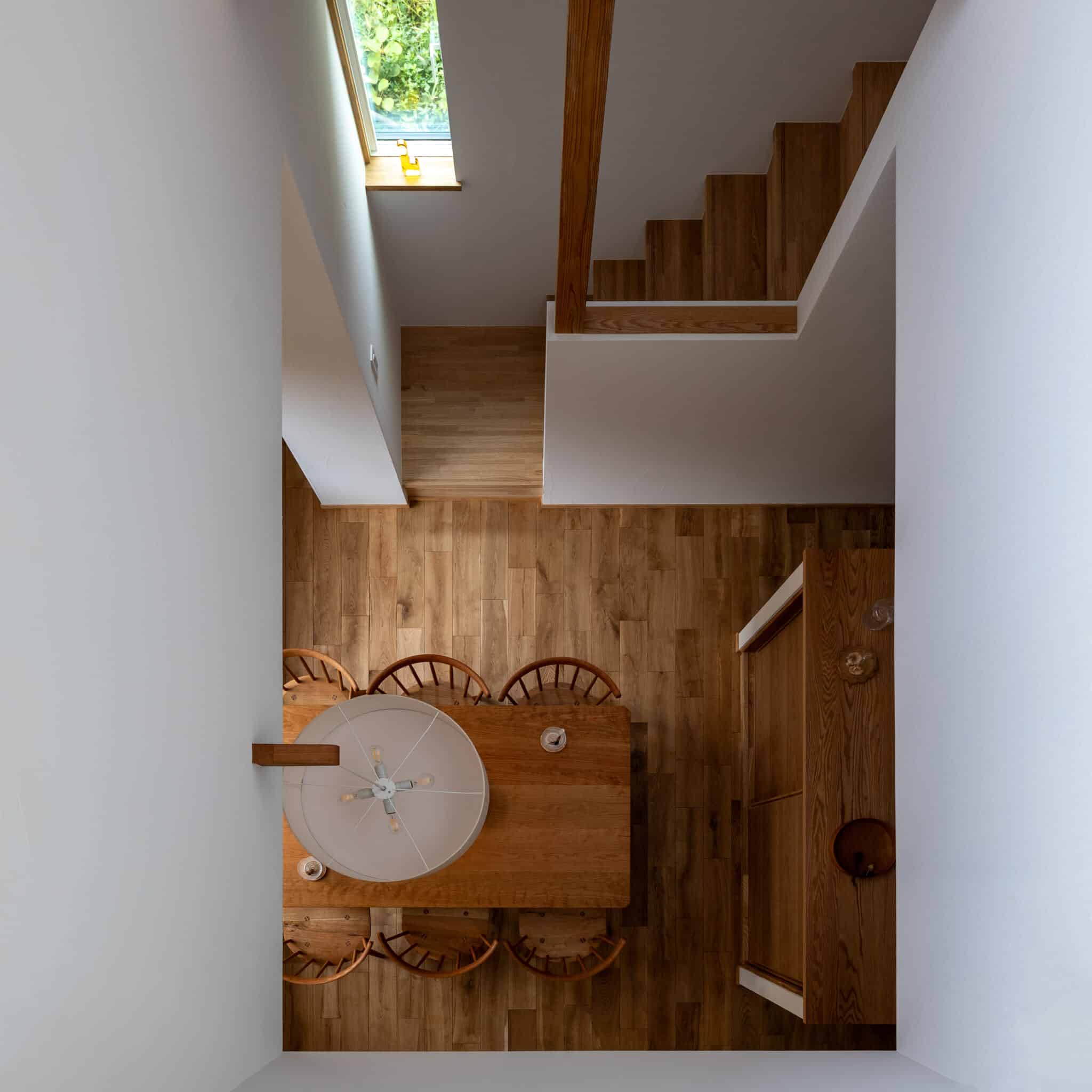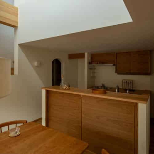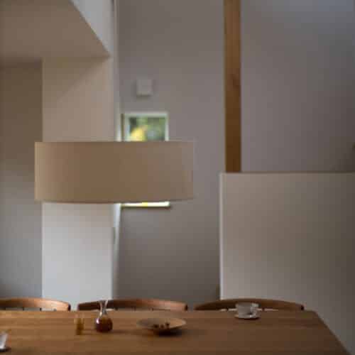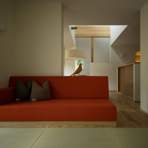 南面の増築部分を減築し、南面のプライベートな庭をしっかりとり確保、吹抜を家の中心に据え、ハイサイドライトから降り注ぐ陽光と3D的なワンルーム空間により家中どこでも家族の雰囲気を感じる構成にしました。