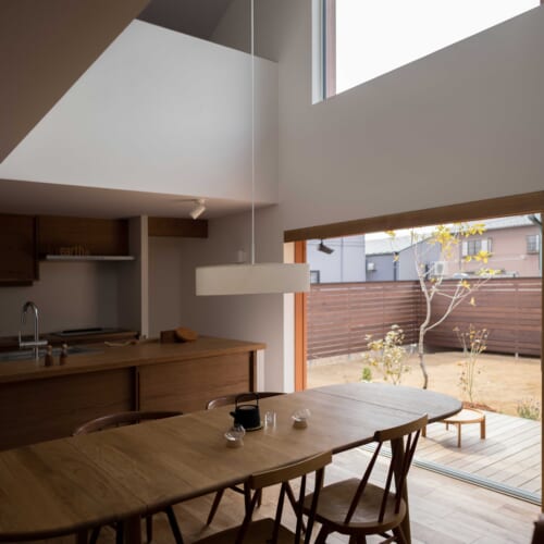 住宅密集地で、空と庭に広がる暮らしのある三角屋根の家