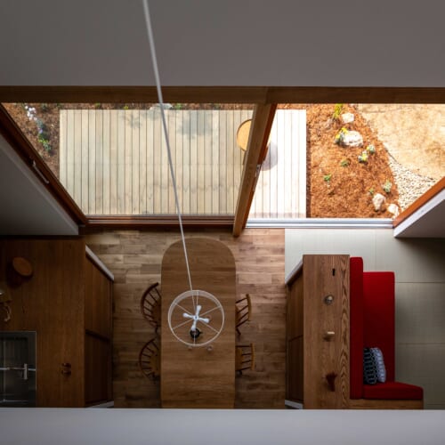 大きな切妻屋根が、2層の立体的なワンルームの内部空間を包み混む構成